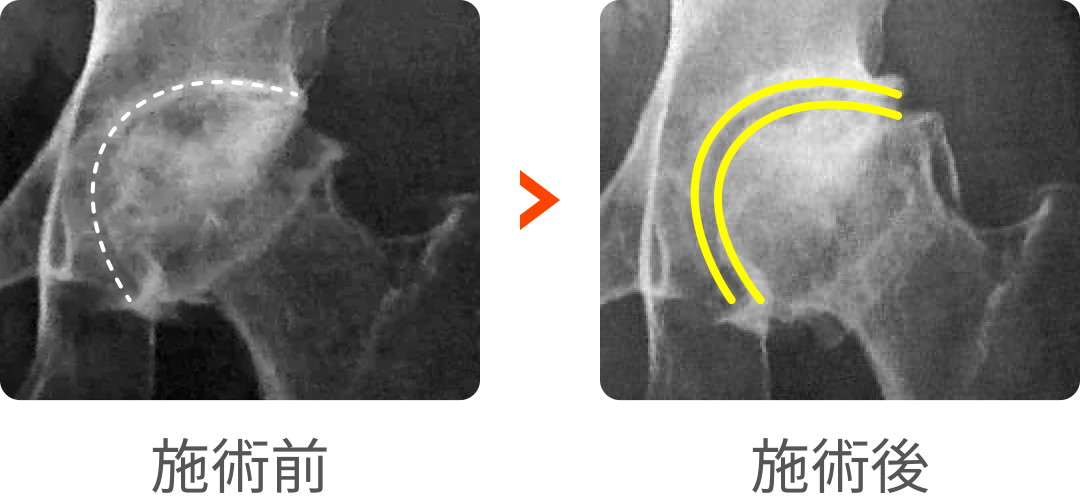 左のレントゲン写真では、大腿骨頭のラインが不鮮明で途中で途切れたりしています。一方、右のレントゲン写真では、大腿骨頭のラインがいびつではありますがはっきり見えるようになりました。